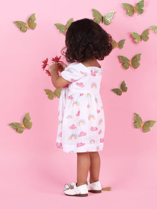 Polka Tots Halfsleeves Rainbow Mist print frock with headband - Multicolor