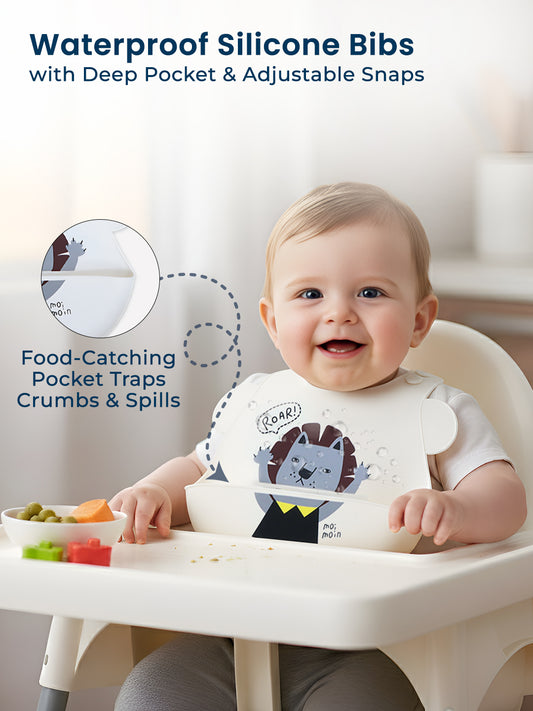 Polka Tots Waterproof Silicone Bibs with Pocket and Adjustable Snaps (White Lion)