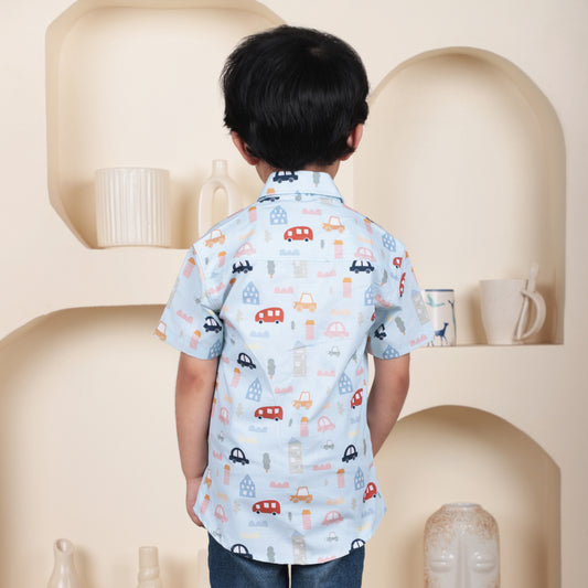 Polka Tots Half Sleeves Vehicles print Shirt - Blue