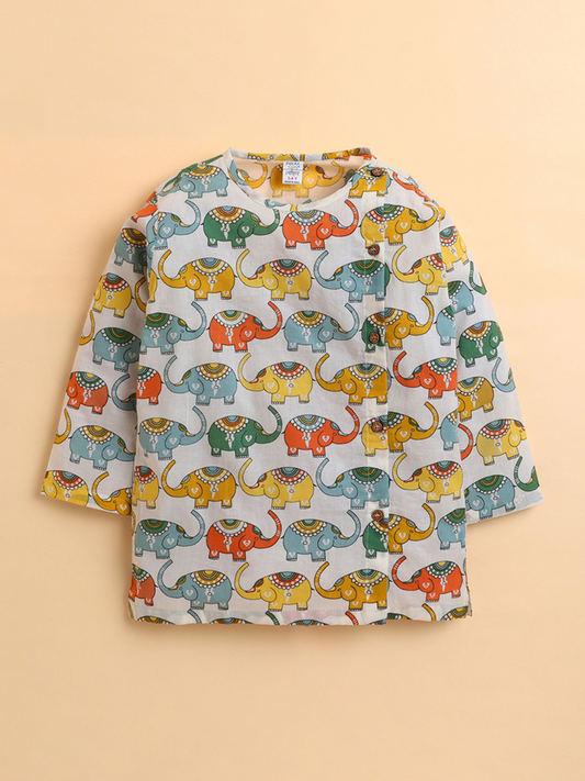 Polka Tots Full Sleeve Elephant Print Angrakha Top With Dhoti - Multicolor