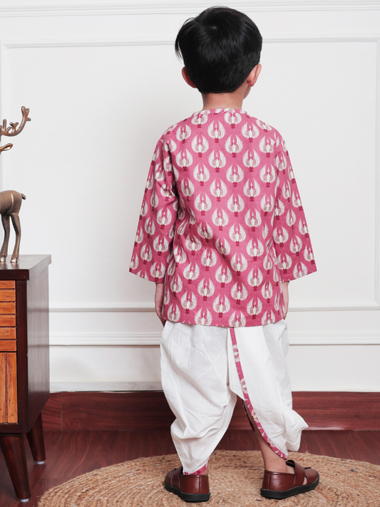 Polka Tots Full Sleeve Bird Print Angrakha Top With Dhoti - Pink