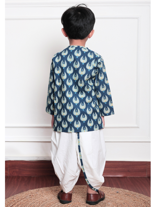 Polka Tots Full Sleeve Bird Print Angrakha Top With Dhoti - Blue