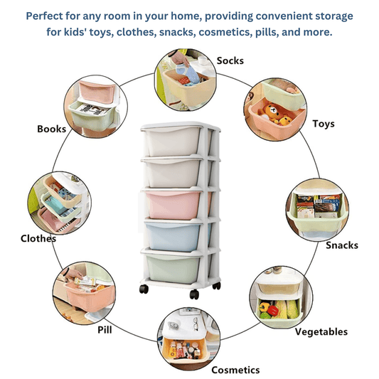 Polka Tots QuackStack Kids Storage Drawer Rack 4-Tier Toy, Book & Clothes Organizer with Wheels - White