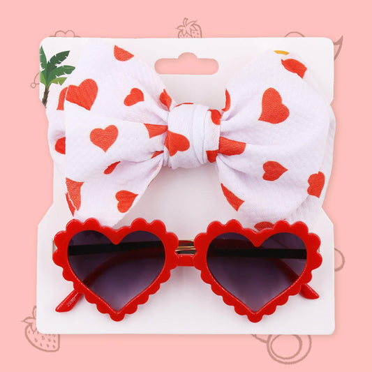 Polka Tots Baby Girls Heart Print Bow Headband with Heart Shaped Sunglasses Set - Red