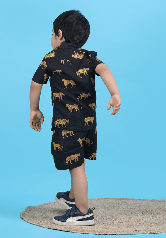 Polka Tots Half Sleeves Leopard print Co-ord Shorts - Black