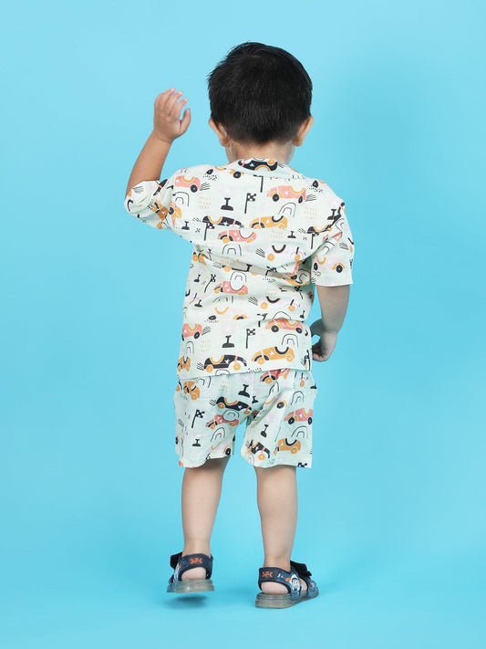 Polka Tots Half Sleeves Racing car print Shirt Shorts - Light Green