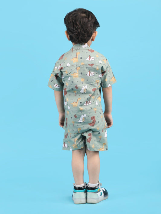 Polka Tots Half Sleeves Dinosaur print Shirt Shorts - Green