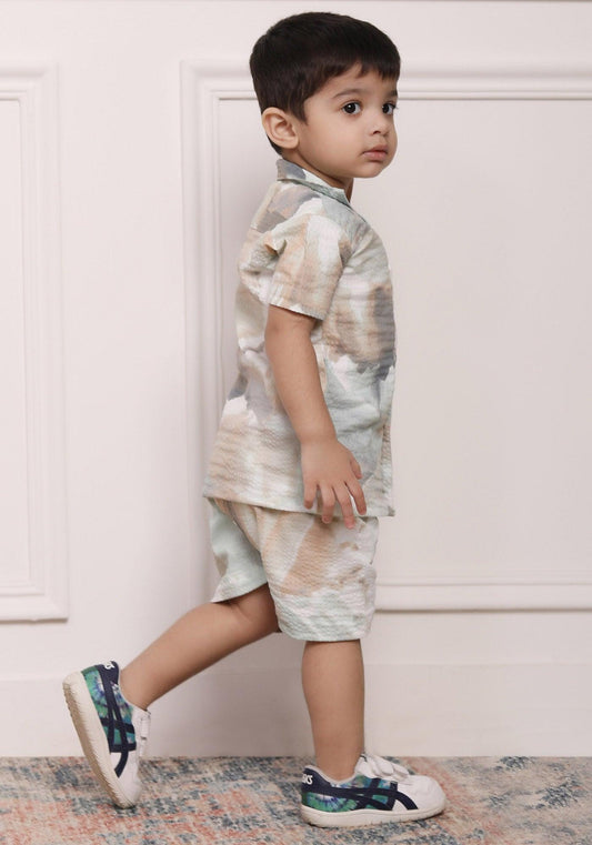 Polka Tots Cotton Half Sleeves Shirt With Shorts/Co-ord - Biege and Blue