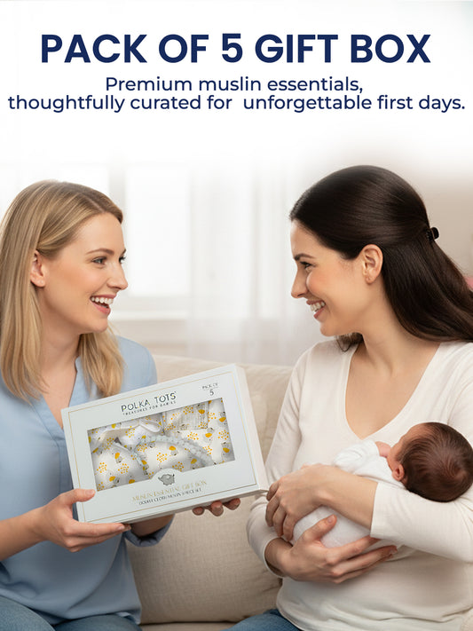 Polka Tots Newborn Pack of 5 100% Soft Double-Layer Muslin Cotton Essentials Gift Box – Jumbo Jr. Print