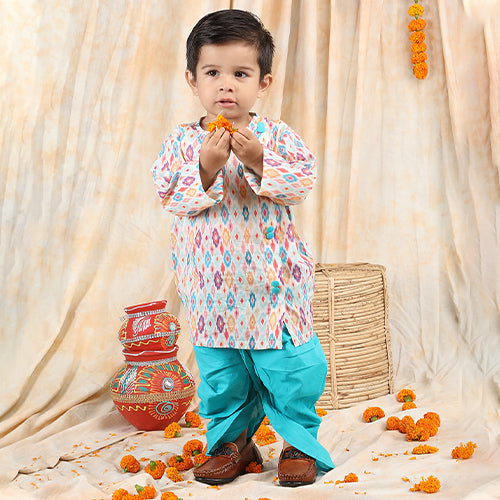 Polka Tots Full Sleeve Abstract print Angrakha With Dhoti - Turquoise Blue