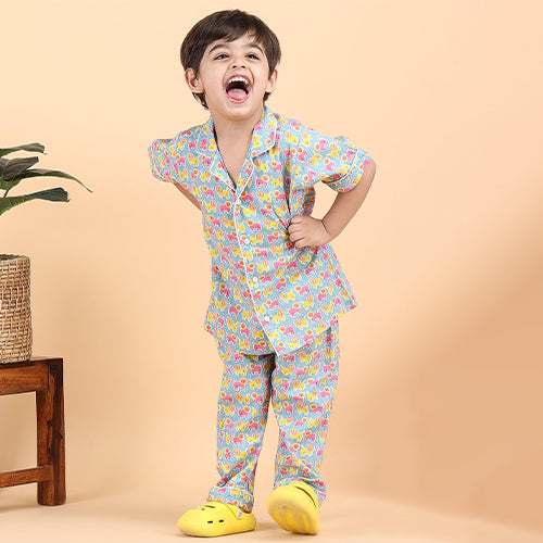 Polka Tots Half Sleeves Lion print Night Suit - Light Blue