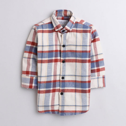 Polka Tots checks full sleeves shirt with blue bow tie elbow patch - Red