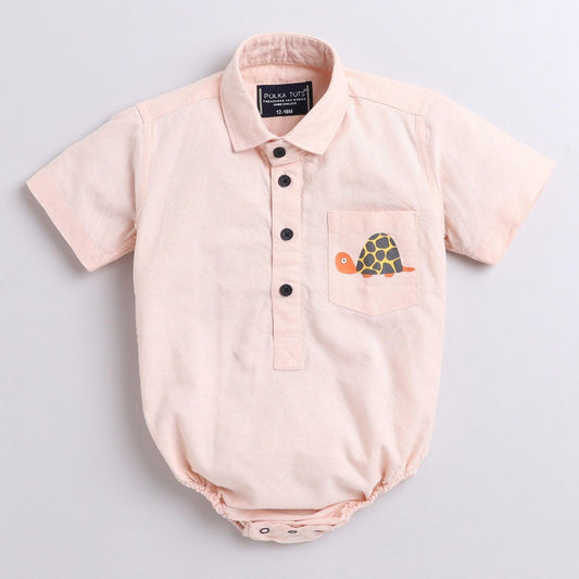 Polka Tots Half sleeve Shirt Romper With Pocket Turtle Sticker - Peach