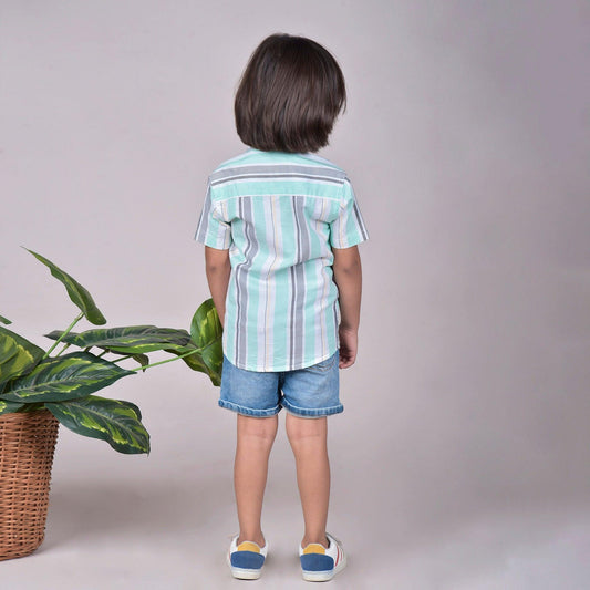 Polka Tots Half Sleeves Stripes Shirt - Aqua Blue and Grey