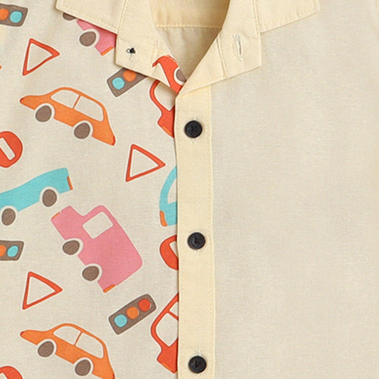 Polka Tots Cotton Regular Fit Half Printed Car Theme Shirt - Yellow