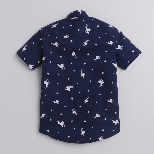 Polka Tots Cotton Regular Fit Half Sleeve Reindeer & Polka Dots Print Shirt - Navy Blue