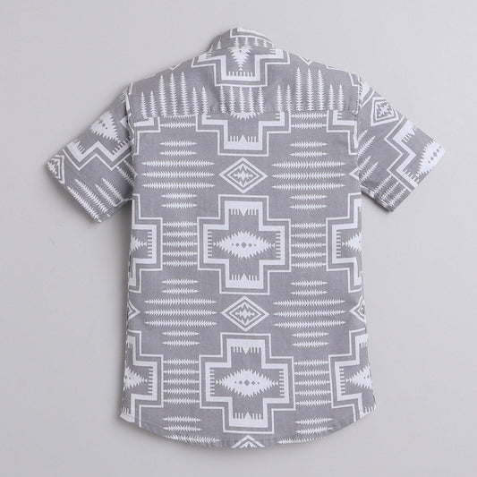 Polka Tots Cotton Regular Fit Half Sleeve Chinese Collar Geometric Print Shirt - Grey