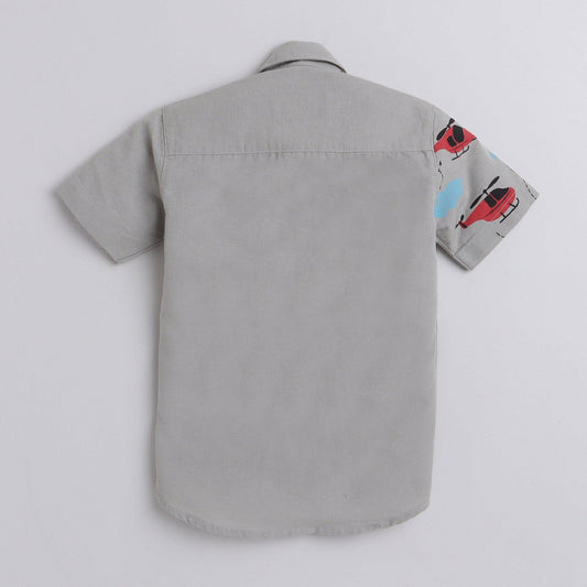 Polka Tots Cotton Regular Fit Half Printed Helicopter Sky Theme Shirt - Grey
