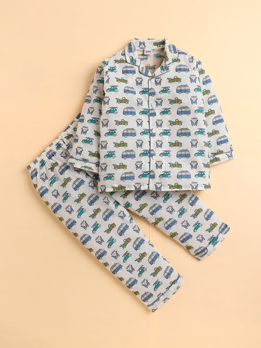 Polka Tots Full sleeve Vehicle Print Night suit - Blue