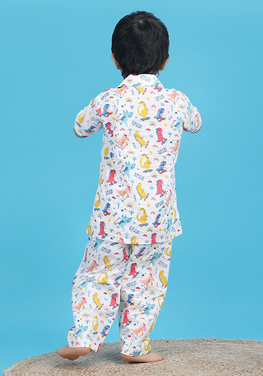 Polka Tots Full sleeves Dinosaur print Night Suit - White