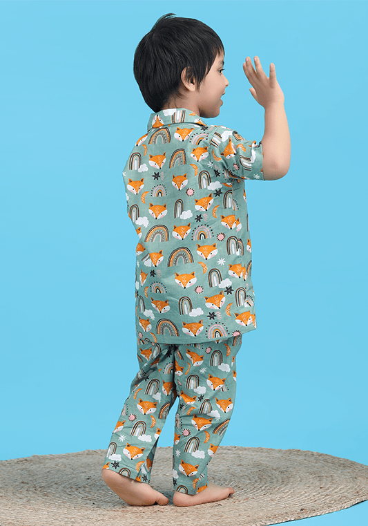 Polka Tots Half Sleeve Fox print Night Suit - Green