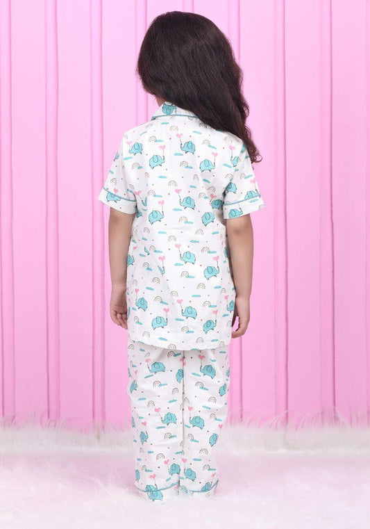 Polka Tots Half Sleeve Elephant print Night Suit - White