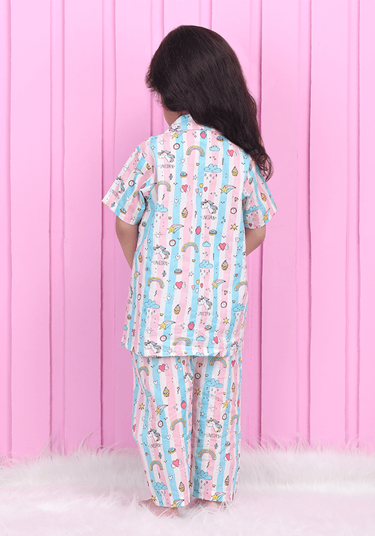 Polka Tots Half Sleeve Unicorn Stripes Print Night Suit - Multicolor