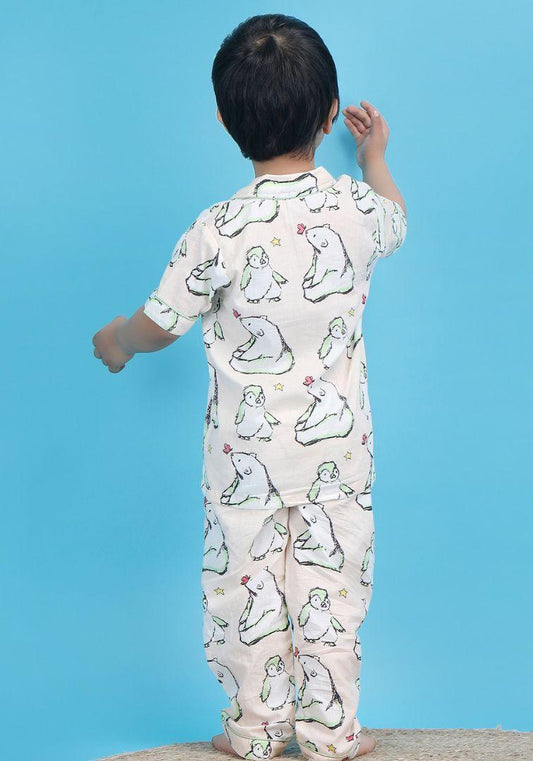 Polka Tots Half Sleeve Bear and Penguin print Night Suit - Peach