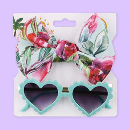 Polka Tots Baby Girls Floral Print Bow Headband with Heart Shaped Sunglasses Set - Aqua