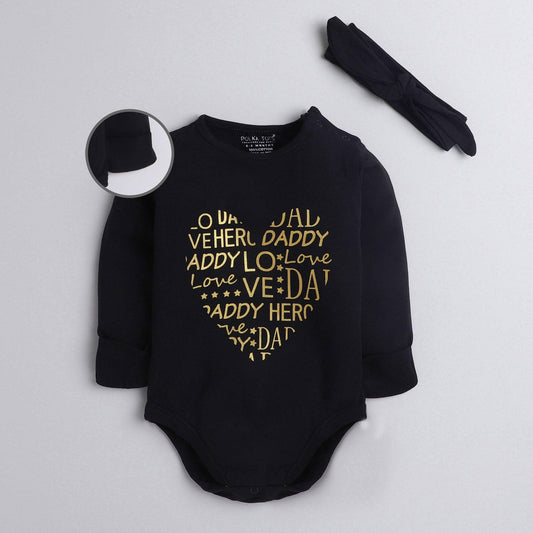 Polka Tots Full Sleeve Romper Onesie with Folded Mittens and Extra Headband Daddys Love Black