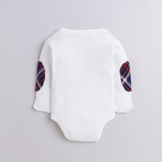 Polka Tots Full Sleeve Romper Onesie with elbow checks patches and bow tie with Folded Mittens 100% Super Soft Cotton White