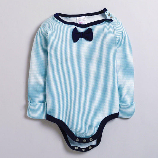 Polka Tots Full Sleeve Romper with Folded Mittens 100% Cotton Applique Bow Tie Blue