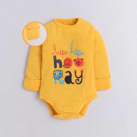 Polka Tots Full Sleeve Romper Onesie with Folded Mittens 100% Super Soft Cotton Hip Hip Hooray Yellow