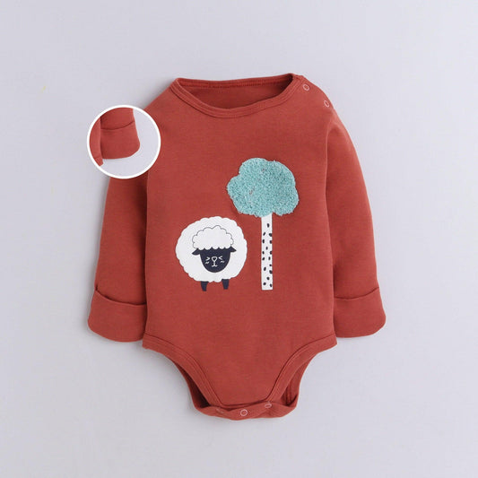 Polka Tots Full Sleeve Romper Onesie with Folded Mittens 100% Super Soft Cotton Sheep and Tree Rust
