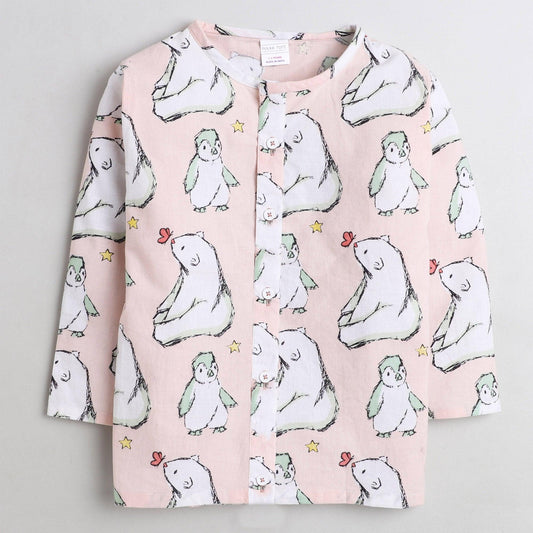 Polka Tots Bear print Front Open Full sleeves Nightwear Kurta pyjama set - Peach