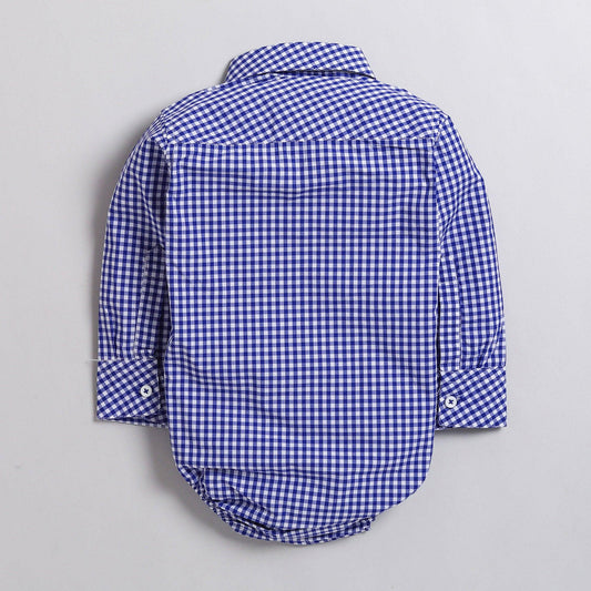 Polka Tots Partywear Full Sleeve Checked Shirt Romper with Velvet Bow Tie 100% Cotton Blue