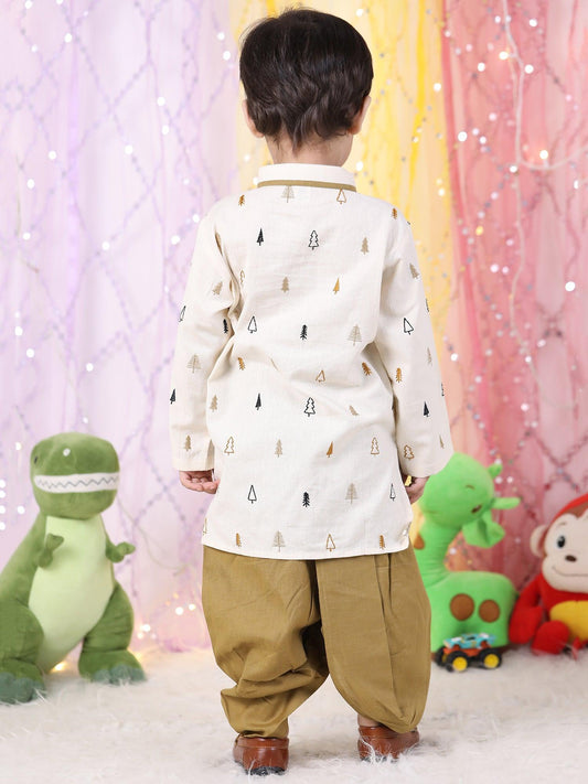 Polka Tots Full Sleeve Christmas tree Embroidery Kurta With Dhoti Set - Brown