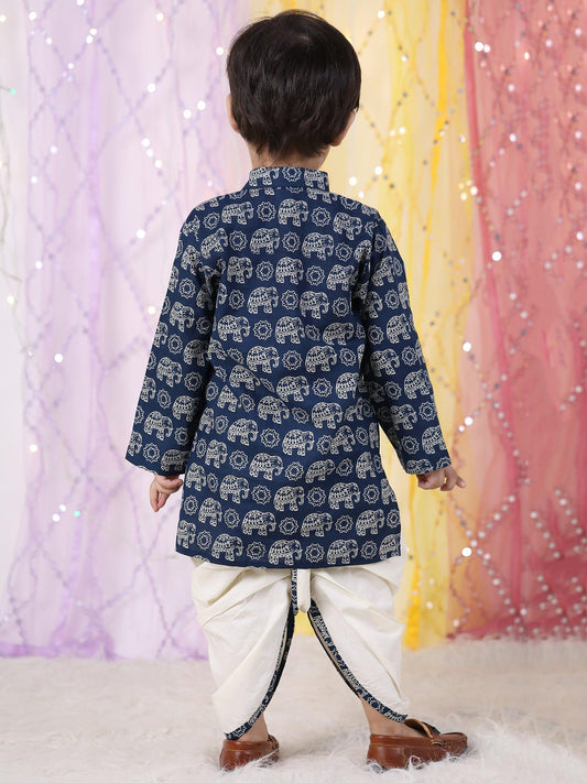 Polka Tots Full Sleeve Elephant print Kurta With Dhoti Set - Navy Blue
