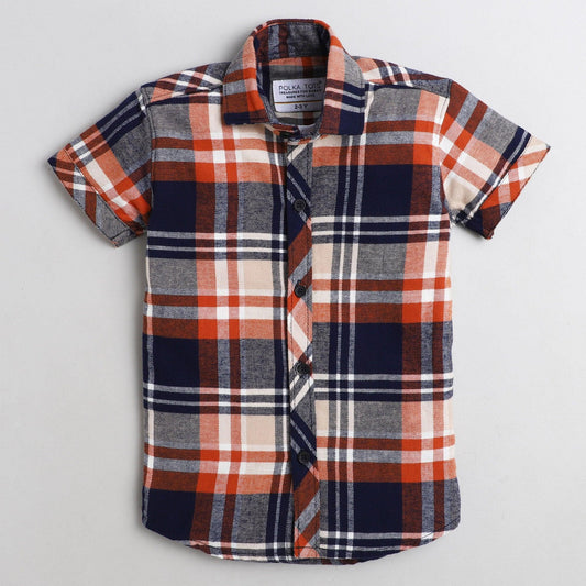 Polka Tots Half Sleeve Shirt 100% Cotton Checkered With Inside Tshirt Dinosaur Print - Orange