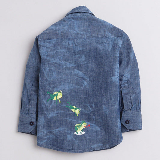Polka Tots Full Sleeve Denim Kids Shirt Be Little Brave Frog Print - Blue