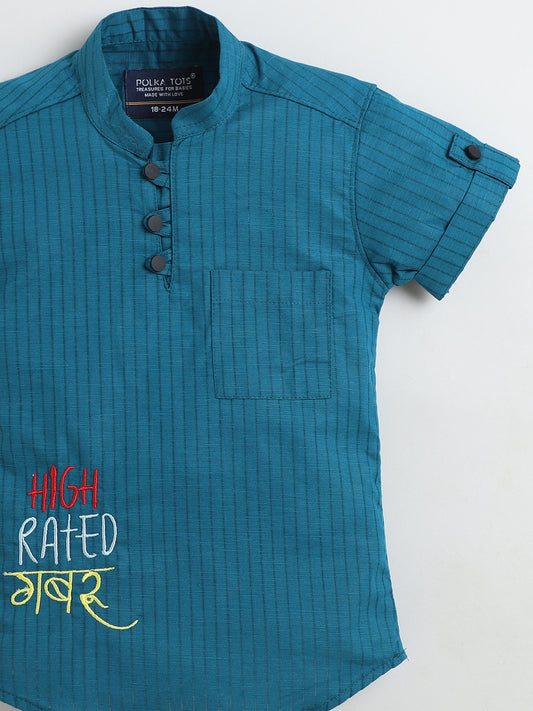 Polka Tots Half Sleeve Striped Kurta with Hindi Graphic - Teal Blue