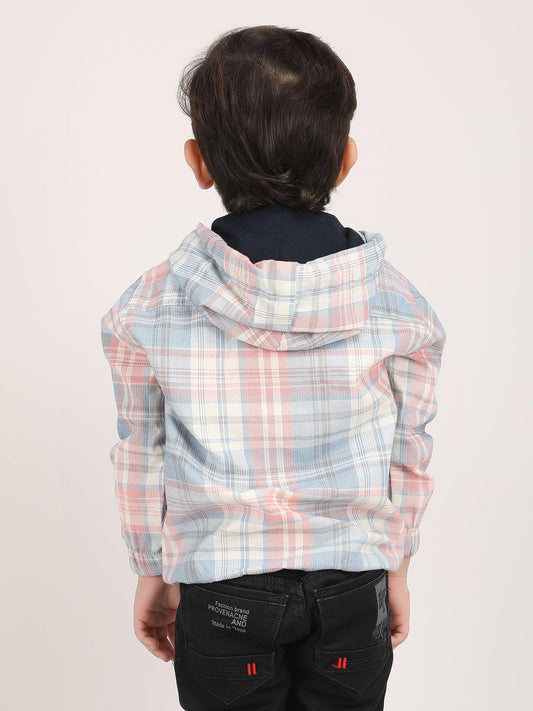 Polka Tots Full Sleeves Checks Printed Hooded Kids Shirt - Blue