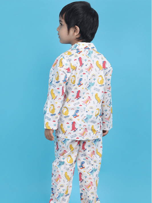 Polka Tots Full sleeves Dinosaur print Night Suit - White