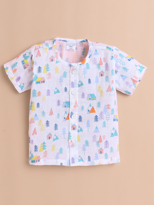 Polka Tots Soft Muslin Cotton Half sleeves Tiny Town print Jhabla and Pant Set - White