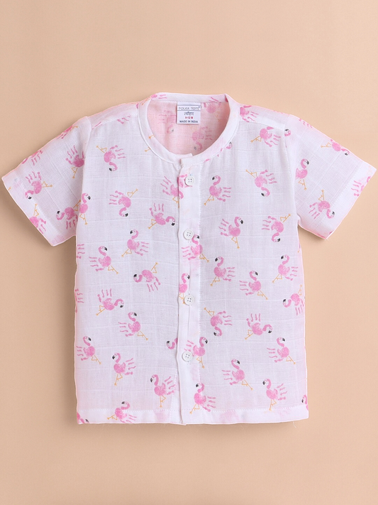 Polka Tots Soft Muslin Cotton Full sleeves Flamingo Fingers print Jhabla and Pant Set - White & Pink