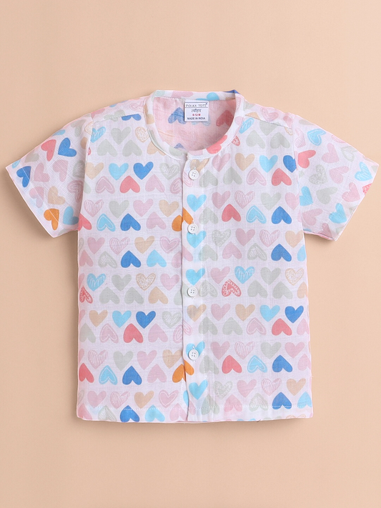Polka Tots Soft Muslin Cotton Half sleeves Mini Hearts print Jhabla and Pant Set - Multicolor