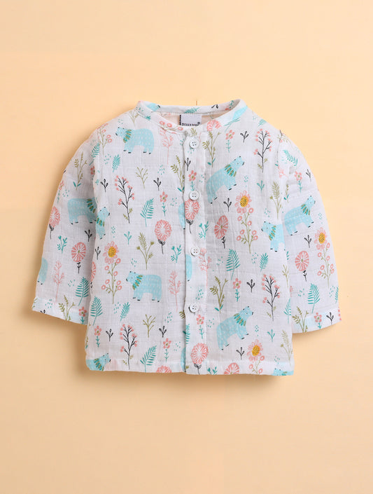 Polka Tots Soft Muslin Cotton Full sleeves Bloomy Bear Print Jhabla and Pant Set - Multicolor