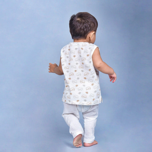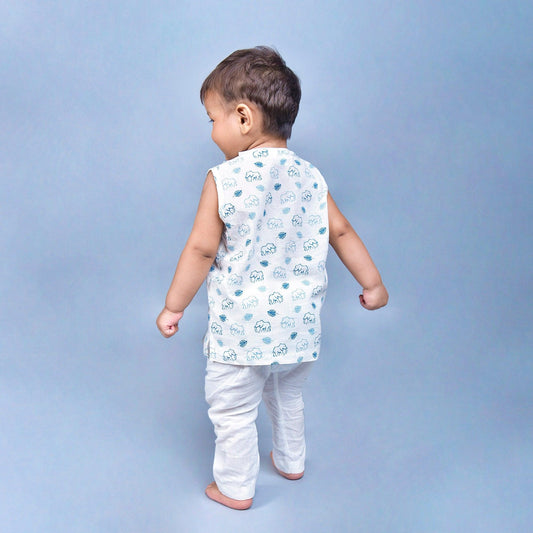 Polka Tots Elephant Print Sleeveless Jhabla and Pant Set - White & Blue