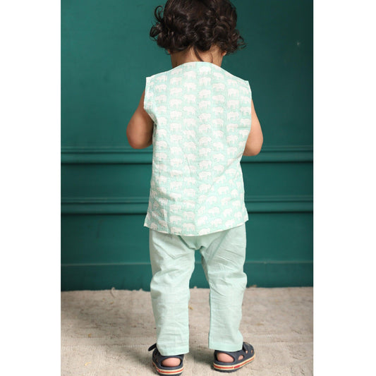 Polka Tots Elephant Print Sleeveless Jhabla and Pant Set - Light Green