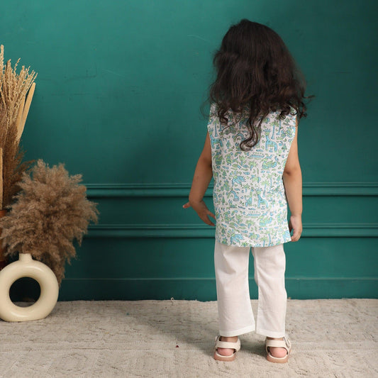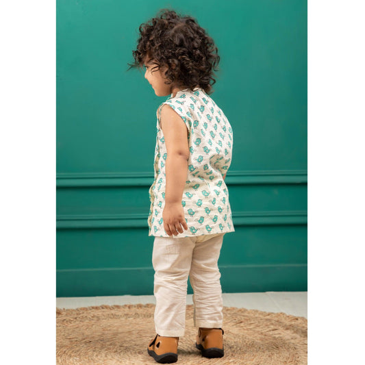 Polka Tots Peacock Fish Print Sleeveless Jhabla and Pant Set - White & Green
